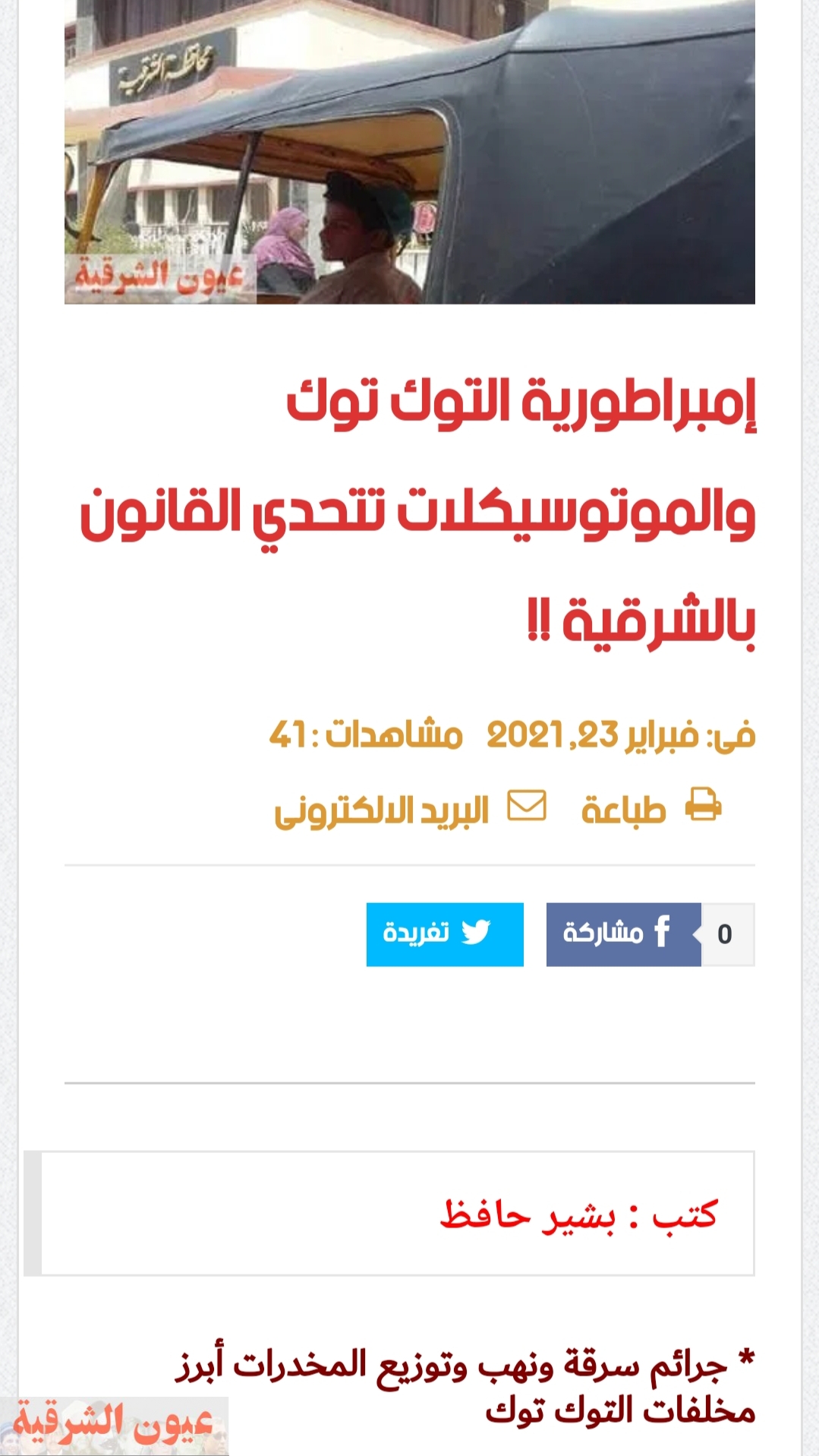 نشرت جريدة ” عيون الشرقية الآن ” ، أمس الثلاثاء ، تقرير بعنوان ” إمبراطورية التوك توك تتحدى القانون بالشرقية ” ، وفور نشر التقرير وجه الدكتور ممدوح غراب محافظ الشرقية ، العميد رضا فوزي مدير إدارة المرور بتكثيف الحملات المرورية بالشوارع الرئيسية والميادين العامة بمدينة الزقازيق لضبط مركبات التوك توك المخالفة للترخيص وخطوط السير، وإتخاذ ما يلزم قانوناً حيال المخالفين لإعادة الإنضباط للشارع.