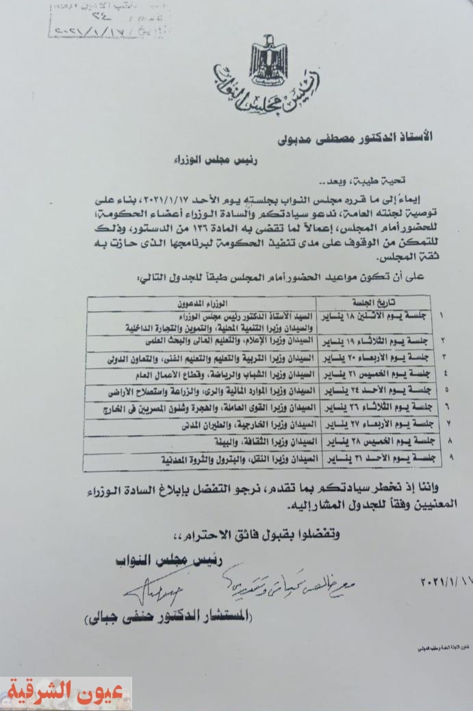 «عيون الشرقية الآن» تنفرد بنشر خطاب رئيس مجلس النواب، إلى الدكتور مصطفى مدبولي رئيس مجلس الوزراء، والذي يتضمن جدول مثول الوزراء أمام نواب الشعب .